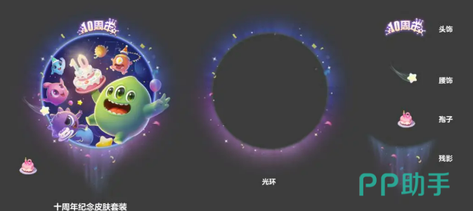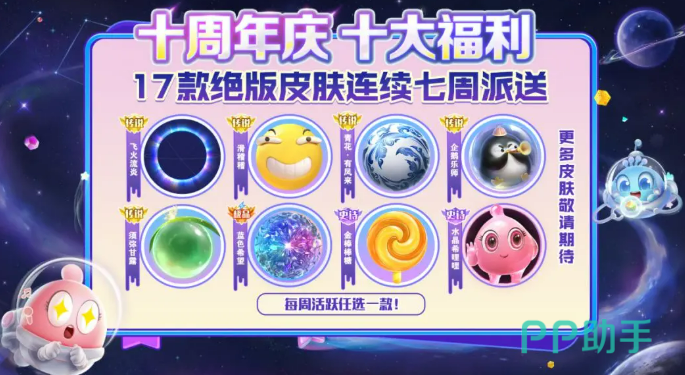 这次的周年庆活动从8月1号正式启动,刚一进入游戏,玩家们就能感受到浓厚的庆祝氛围。首当其冲的是一套极具纪念意义的十周年纪念皮肤套装。这个皮肤套装相当奢华,涵盖了头像、头饰、帽子、残影和光环等多个部分,不仅让你的球球造型更炫酷,还能随时彰显你的“十年老玩家”身份。更让人兴奋的是,参与这次周年庆活动的玩家,还能通过一个幸运抽奖活动,获得高达300次的抽奖机会!可以说300抽的机会,让你几乎可以把所有福利收入囊中。
