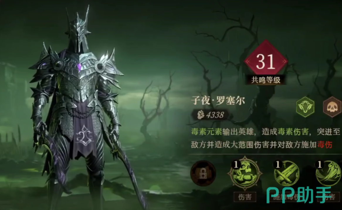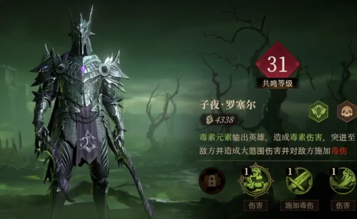罗塞尔在游戏当中属于毒属性的输出角色,在他造成毒属性伤害时,可以突进至敌方单位的面前,并且同时造成大范围的毒属性伤害攻击,罗塞尔的整体攻击倍率实际上不算高,但由于其特殊dot机制,可以给敌人造成大量伤害。
