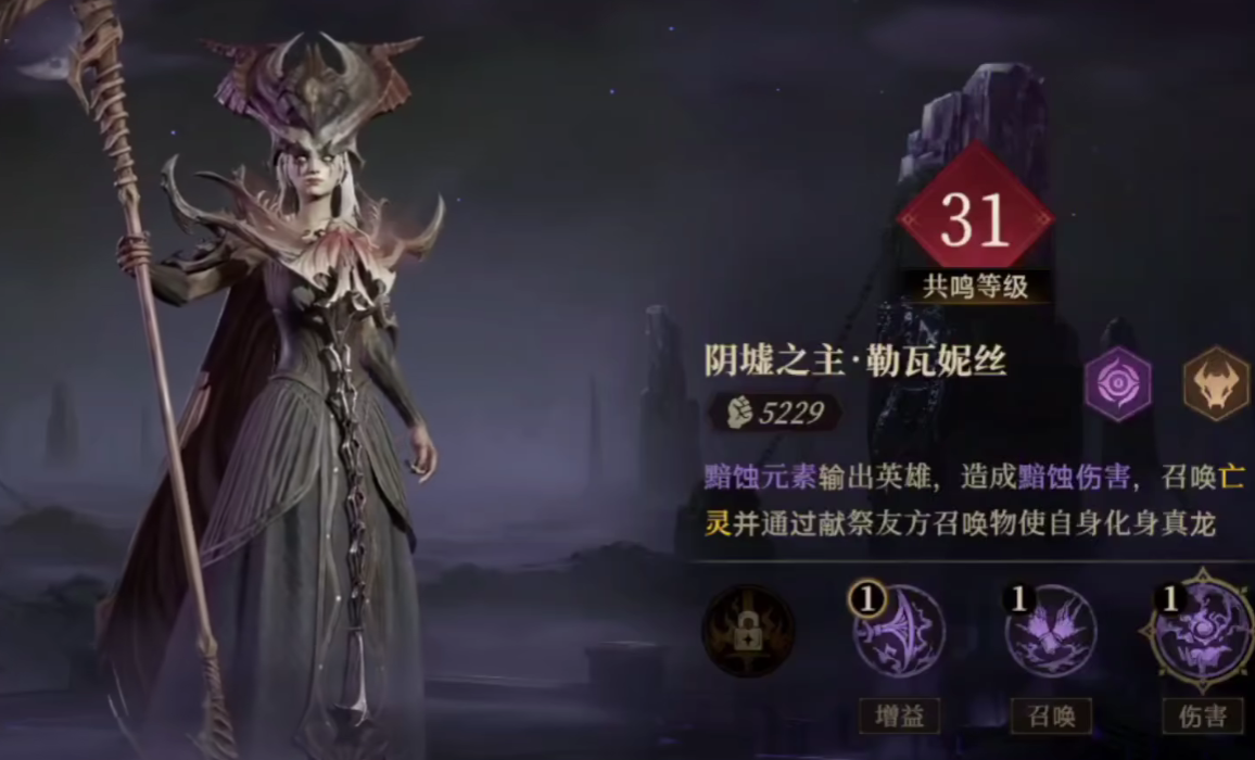 勒瓦尼斯可以充当队列内的主要C位角色,她可以对敌人造成暗属性的暗示伤害,并且召唤亡灵,通过献祭队友的方式,来化身成为真龙,真龙的增益效果是非常高的,在真龙成功召唤后,可以对敌人造成基础攻击倍率为250%的伤害。