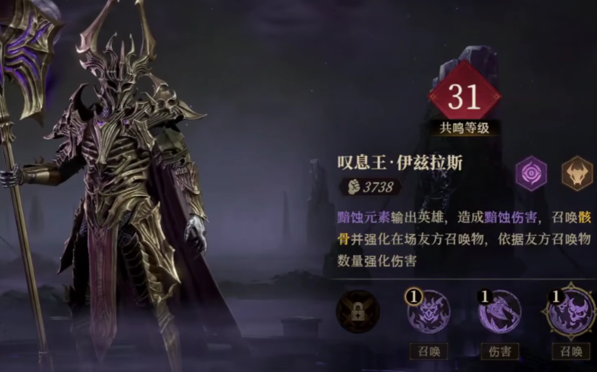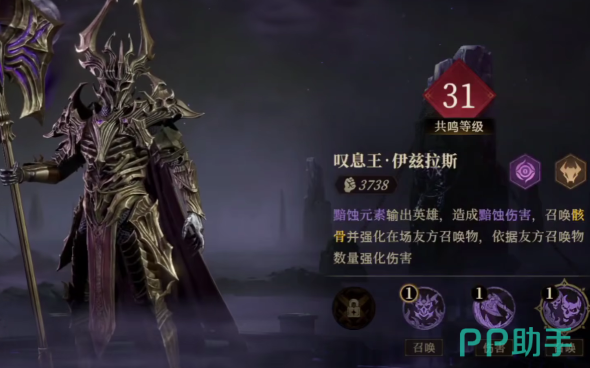 伊兹拉斯在游戏当中是最强的一个坦克单位,它可以召唤骸骨,并且强化场地当中存活的所有友方角色,包含召唤物,在被强化之后,召唤物和角色的基础攻击倍率不仅能够提高,生存概率也能够增加,不止如此,伊兹拉斯还拥有队列内最强的防御能力。
