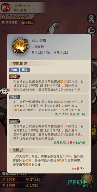 必杀技「罪火剑影」专注单体斩杀:初始可对敌方生命百分比最低单位造成252%物理伤害;每存在1层灼烧或烈焰灼烧,额外附加25%攻击力的伤害,最多叠加5层(即+125%攻击力)。当蛇灵升至16星,基础伤害跃升至386%,单层灼烧增伤提升至35%,上限达+175%攻击力;强化后伤害进一步提升至413%,单层增伤达40%,最高额外造成200%攻击力伤害,并恢复自身造成伤害50%的生命值,觉醒后回血比例提升至60%。