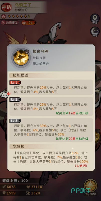 另一被动「报丧乌鸦」强化战斗节奏适应性:行动前有概率触发,成功后立即提升20%攻击力;场上每存在1名已阵亡友方单位,额外获得4%攻击力加成,最多叠加5层(即+20%)。觉醒后,基础增益提升至35%,每阵亡1人提供7%攻击力,同样可叠满5层;更关键的是,当攻击目标身上的灼烧层数≥3时,乌鸦王子暴击率额外提升100%——这使其在灼烧叠满后的下一轮攻击,几乎必然触发高额暴击,实现真正意义上的“三火必爆”。