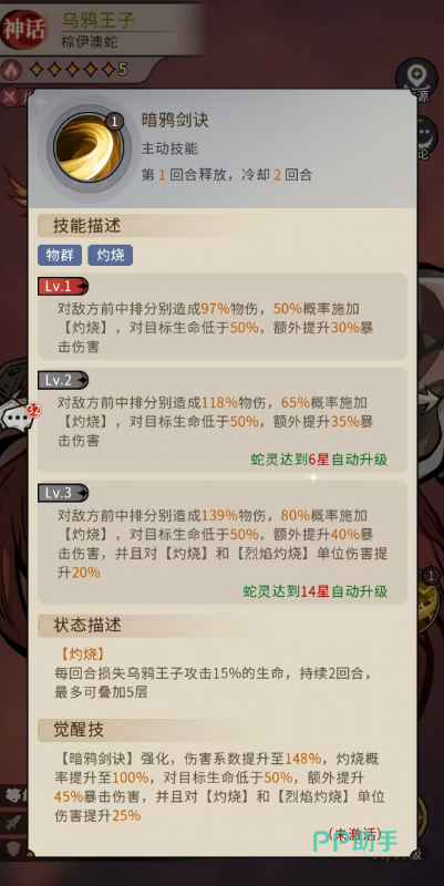 其核心主动技能「暗鸦剑诀」具备先手群攻特性:初始版本可对敌方前排与中排分别造成97%物理伤害,50%概率附加灼烧效果;当目标生命值低于50%时,额外提升30%暴击伤害。升至等级3后,伤害提升至139%物理伤害,灼烧触发概率增至80%,低血量增伤提升至40%,且对已处于灼烧或烈焰灼烧状态的单位,额外提升20%伤害。若达成14星突破,该技能进一步强化为148%物理伤害、100%灼烧必中、低血量暴击增伤达45%,并对灼烧/烈焰灼烧目标再增25%伤害——这意味着该技能已成为稳定挂灼+高效压血的双重引擎。