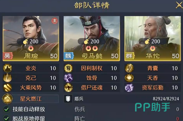 兵种统一选用盾兵,激活三盾兵S级羁绊后,全队所有基础属性提升30%。该数值加成为硬性固定增幅,直接影响角色坦度、治疗量基数及策略伤害计算结果。盾兵自身拥有游戏内最高基础防御成长,再叠加华佗提供的防御强化与持续恢复,使队伍整体抗压能力跃升至一线梯队水平。军法搭配方面:司马懿侧重策略增伤与中毒强化,推荐【军略】【计成得势】【集智】【善谋】【奇谋】;周瑜按策略输出定位配置,主堆策略攻击与暴击相关属性;华佗则选用【励军】【诱敌而击】【乐善】【奋主】【活气】,以最大化治疗量、延长控制时间并增强团队协同响应能力。