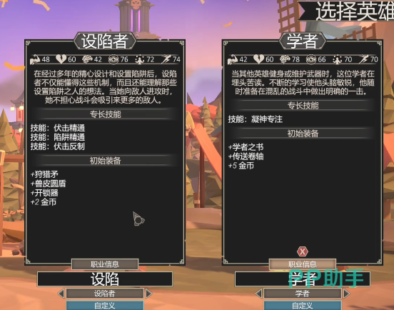 游戏初期,玩家可直接从四位基础角色中选择其一开启旅程,无需额外解锁条件,非常适合新手阶段熟悉战斗机制。铁匠作为力量型代表,具备极高的生命值与物理输出能力,既能承担前排抗伤职责,也可切换为狂战士形态进行爆发输出,尤其在面对群体敌人时,范围攻击效果显著。猎人则专注于敏捷流派,凭借高命中与暴击率,常在战斗中率先出手,远程打击能力出众,适合清理后排脆皮单位。学者主修魔法系技能,智力成长优异,能够释放大范围法术伤害,在对抗密集敌群时表现亮眼。而吟游诗人虽不具备高额直接伤害,却是团队不可或缺的支援者,通过演奏乐曲为队友提供攻击力增益,有效提升整体输出效率。