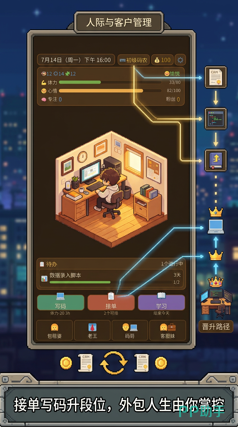《外包人生》是一款深度还原当代自由职业者成长轨迹的模拟经营类手游,主打真实感与策略性。玩家将扮演一名初入行业的外包开发者,在资源有限的起点上开启职业生涯——没有丰厚启动资金,只有一间狭小出租屋、一台基础电脑,以及从零开始积累的技能树。
