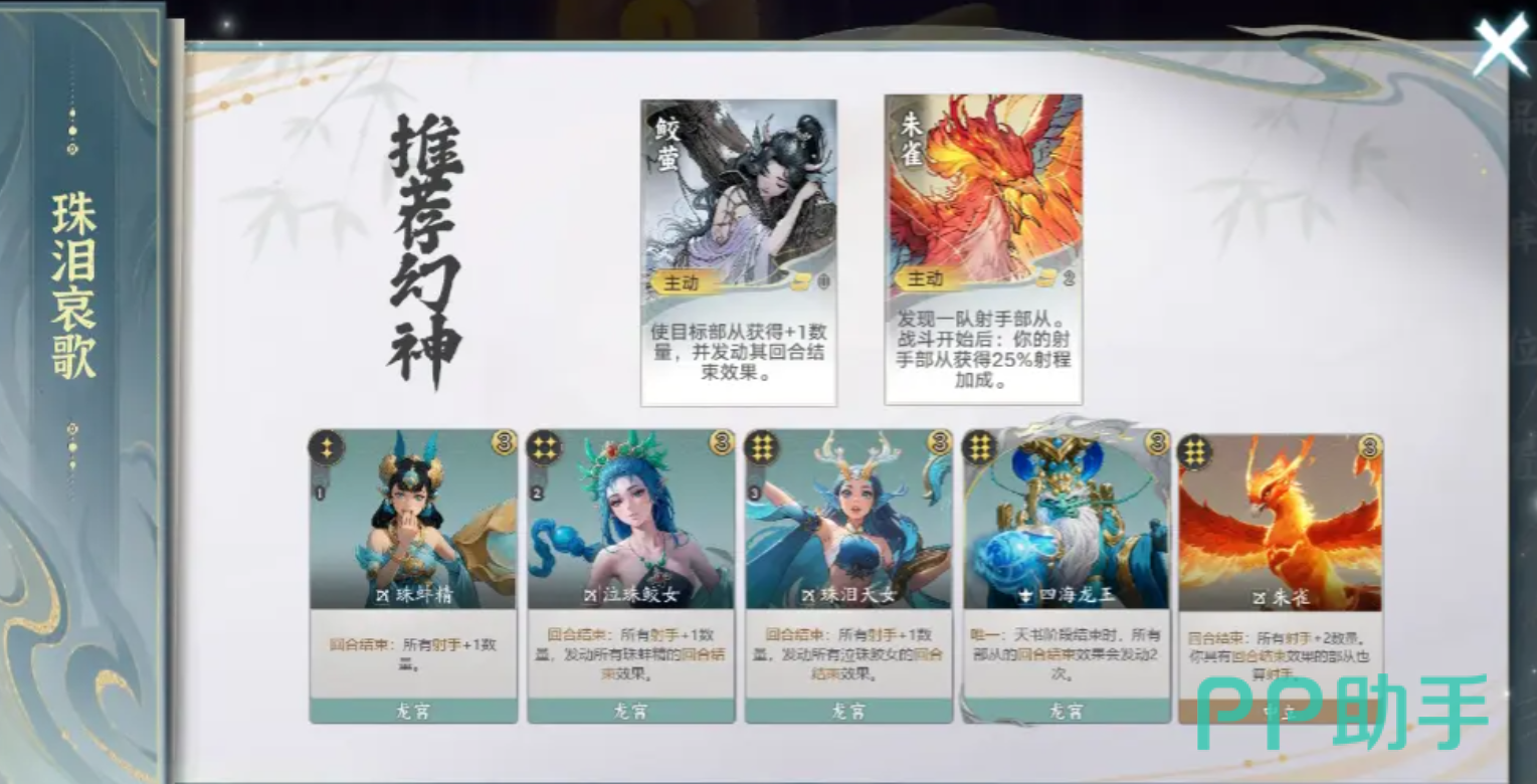 主轴卡牌锁定三张核心:珠泪天女、泣珠鲛女、珠蚌精。三者均携带不可替代的回合结束技能,稳定为己方射手提供数量增幅。辅助组件方面,朱雀负责强化射手基础数量成长效率;四海龙王则通过二次触发回合结束机制,使全队增益效果进入多层嵌套状态,显著延长加成持续时间与叠加次数。