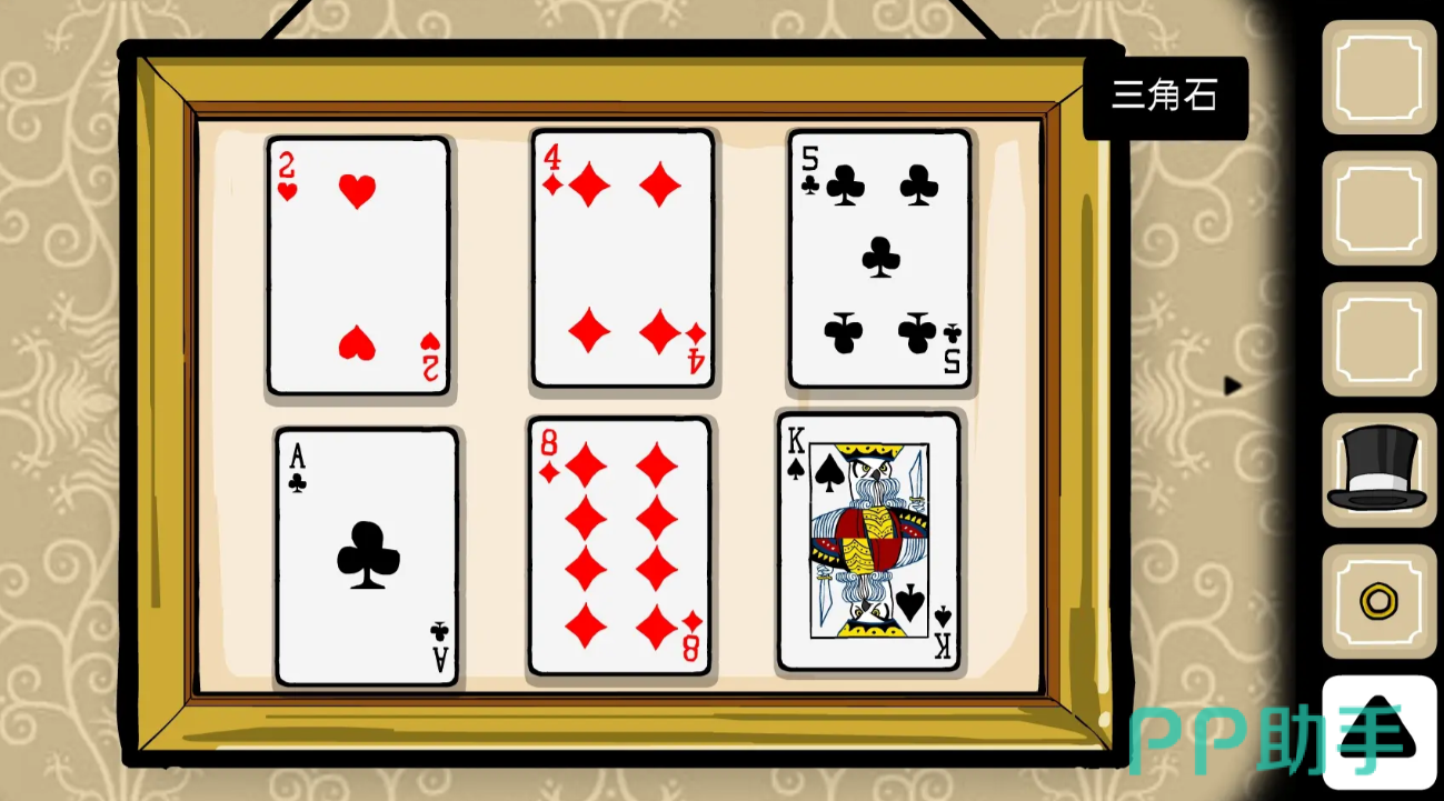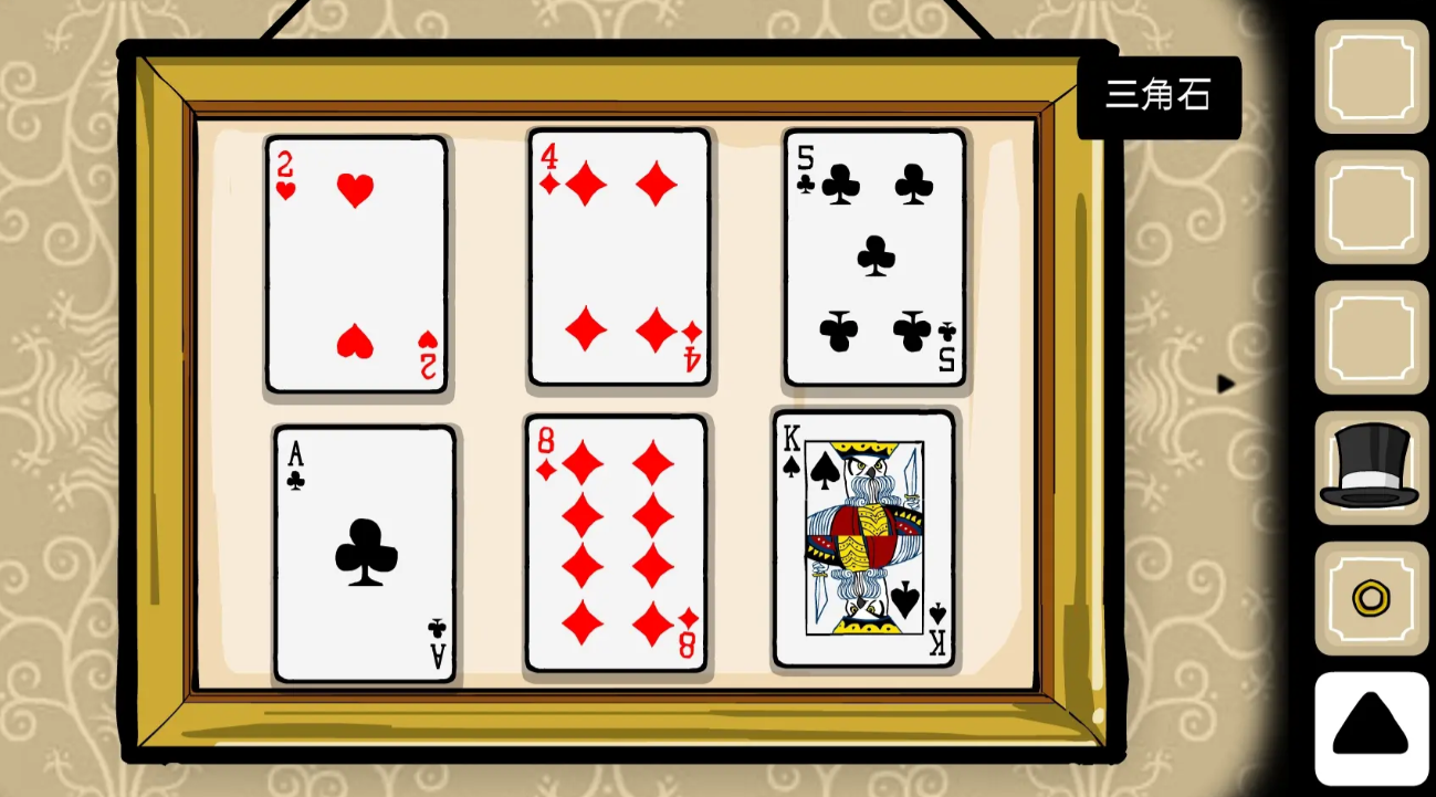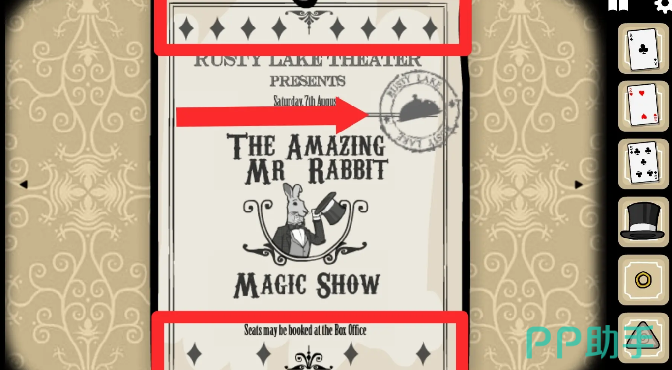 在第三幕的魔术表演内,玩家需要分别选择黑石a、蝴蝶三、心脏七、心脏五这四枚扑克牌,但在此时,玩家可以继续停留在第三个关卡,通过不断点处兔子先生的方式,来完成第三个关卡的特殊成就任务。