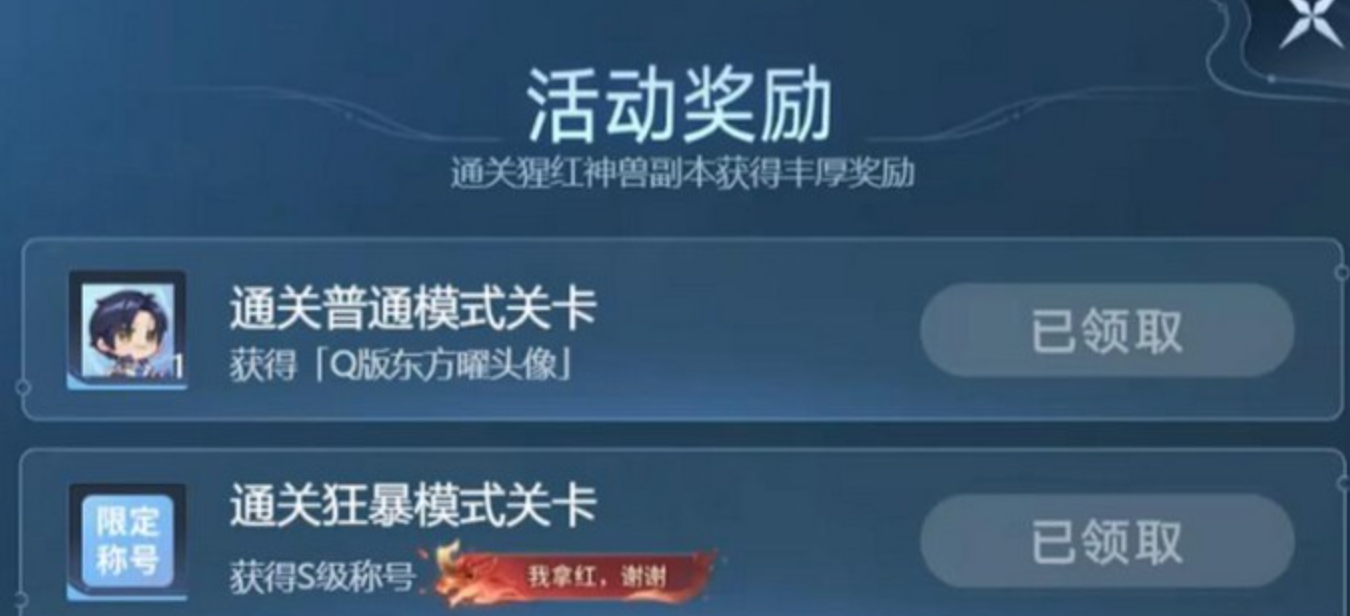 需注意,“猩红神兽”称号并非直接通过主活动开启获取,而是关联于前置剧情活动——“东方曜的梦境”。该活动以云游戏形式呈现,玩家将在梦境场景中直面标志性BOSS“猩红神兽”(即游戏中广为人知的红Buff形态)。成功通关后,除可领取东方曜Q版头像外,还将解锁极具辨识度的称号“我拿红,谢谢”,该称号为全服限量、不可交易、永久绑定账号的专属荣誉标识。