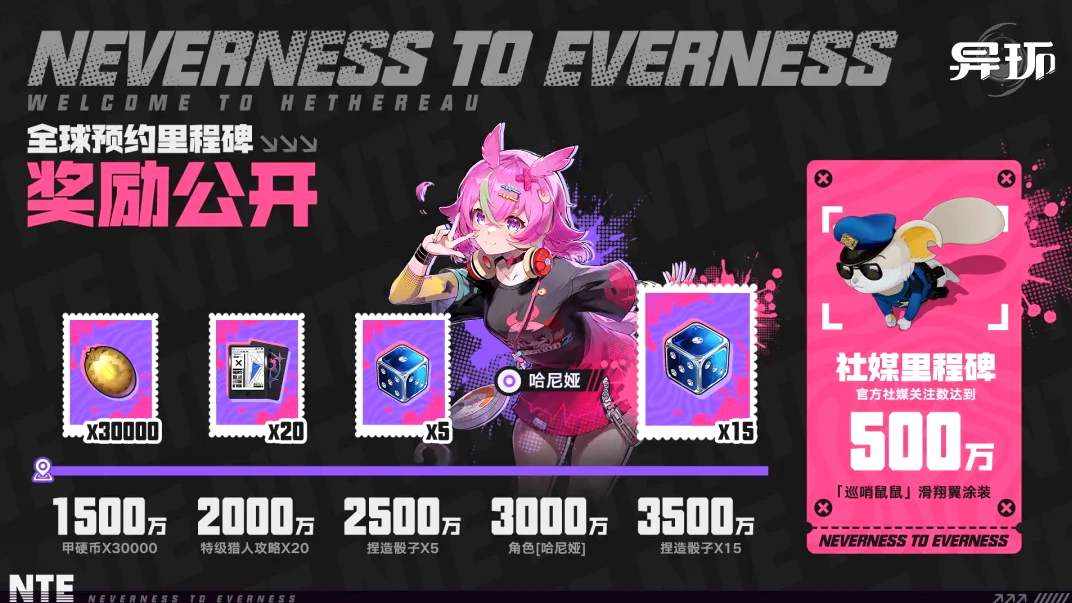 全球预约采用里程碑式奖励机制:预约人数达1500万,全体预约用户可获赠30000甲硬币;突破2000万,解锁20份特级猎人攻略;达到2500万,发放5个捏造骰子;达成3000万预约目标,哈尼娅角色将直接免费解锁;预约量升至3500万,再增15个捏造骰子。此外,当官方社交媒体关注数达到500万时,将同步发放“寻哨鼠鼠”滑翔翼专属涂装;所有预约玩家还可于开服后直接领取普池20连抽资格。