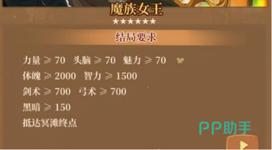 要解锁“魔族女王”这一特殊结局,需满足一系列严格的条件。首先,角色的头脑属性和魅力属性均需达到70或以上;其次,体魄值必须累积至2000及以上;最关键的是,黑暗属性必须提升到150或更高。此外,与关键人物格温妮丝的好感度也至关重要,只有当好感度成功突破100点,才可触发该结局的前置条件。