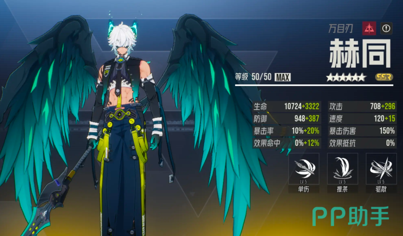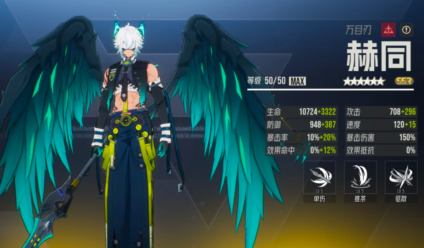 作为一名以防御为基础的反击型输出,赫同兼具伤害与功能性。他的“散流刑”可对单个敌人发动三次基于自身防御力125%的打击,每次命中均有25%概率降低目标防御;被动技能使其在战斗开始时获得500点防御加成,并提升12%反击率与6%伤害;
