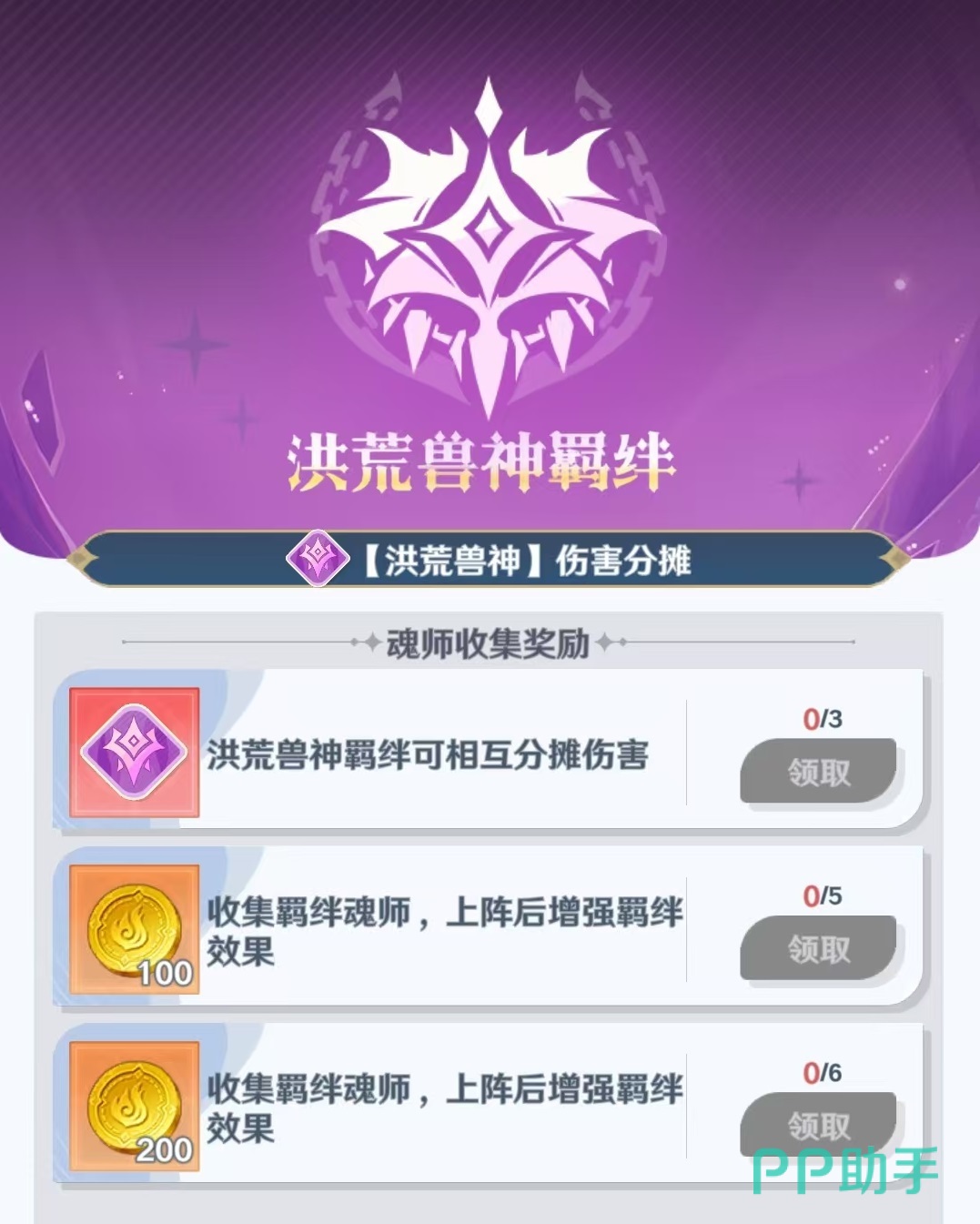 【洪荒兽神羁绊】:3人激活后,所有洪荒兽神魂师共享20%所受伤害,并额外获得5%减伤;5人满配时,伤害平摊比例提升至30%,减伤效果同步增至10%。此羁绊专精于防御协同,是应对高爆发BOSS战或PVP硬碰硬场景的首选方案。