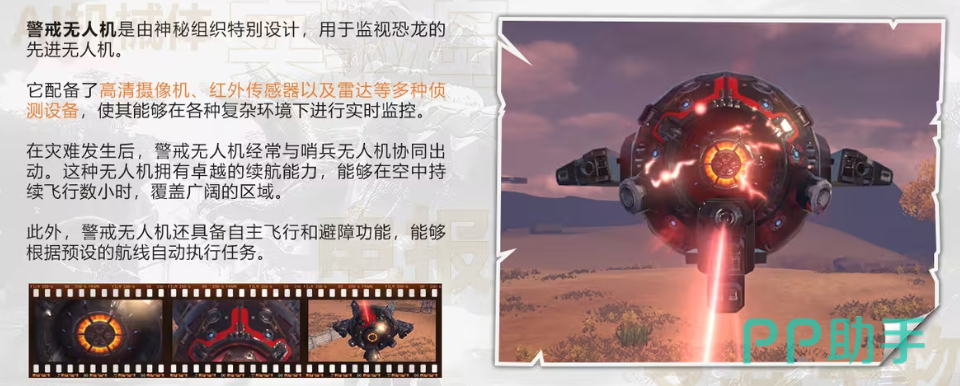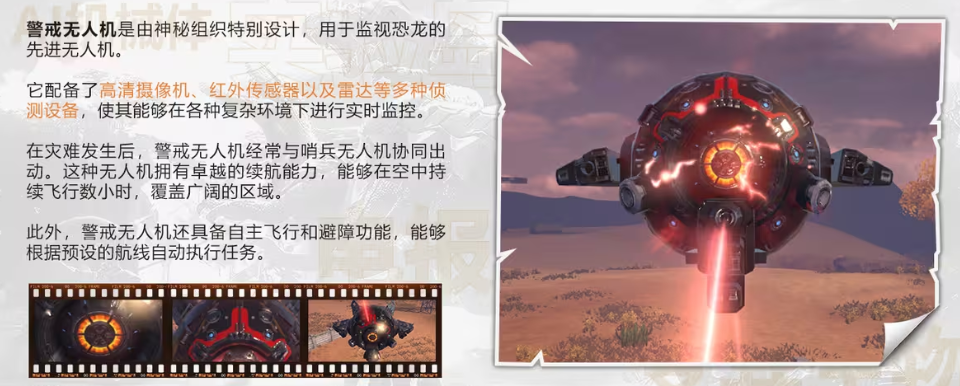 警戒无人机是由神秘组织所设计的,它的作用其实就是监视恐龙,警戒无人机当中匹配了高清的摄像机,红外传感器以及雷达等等多个侦察设备,能够在各种复杂的环境下,进行监控,而它的续航能力比较强,覆盖的区域也特别的广。