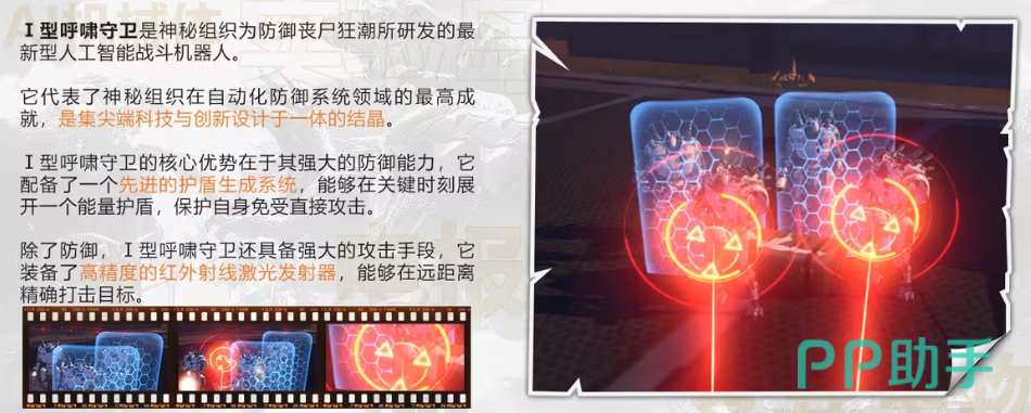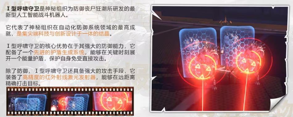 Ⅰ型呼啸守卫是由神秘组织为预防丧尸,所研发出来的一种机器人。它代表的就是神秘组织在自动化领域当中的成就,匹配了一个非常先进的护盾系统,在关键的时候能够打开能量护盾,保护自身不会受到攻击。