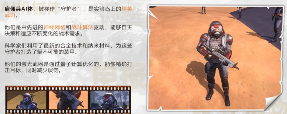 雇佣兵也属于AI机械体,在实验岛上面作为精英武力,是由神经网络和战斗算法来进行驱动的,其实他能够适应不断变化的战术需求。目前这些雇佣兵已经有了非常强悍的装甲,能够精准打击目标,还可以减少误伤。