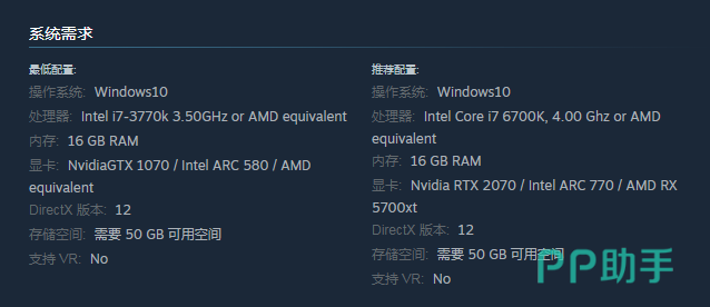 操作系统可以选择 Windows10,处理器这一方面有两种选择,这里推荐大家选择AMD equivalent,还有显卡的选择是比较重要的,玩家可以选择Intel ARC 580 / AMD equivalent,别忘记在储存方面需要保证拥有50 GB 可用空间。