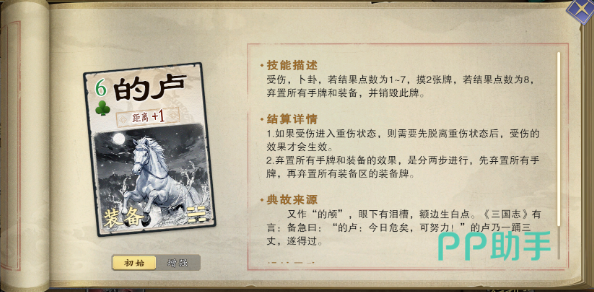 的卢的核心机制在于受伤后触发卜卦判定:若点数为1至7,则可抽取两张手牌;若点数为8,则需弃置所有手牌与装备,并销毁该坐骑。这种“全赢或清零”的设定决定了它不适合保守打法。最佳使用时机并非状态良好时,而是在手牌耗尽或生命值较低的情况下佩戴,从而主动触发其特效,最大化收益的同时规避无谓损失。
