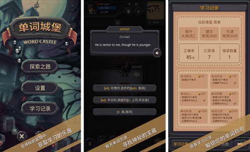 游戏以单词闯关为核心玩法,月色下诡异的城堡独居一偶,游戏将城堡探索和单词拼写完美融合,为了寻找城堡里的宝藏,你需要不断拼写单词咒语。这让背记英语单词多了一丝趣味,还有对应单词解释在下面,无形中加深了玩家对单词的记忆,游戏提供的敌人和单词谜题数量众多,难度比较高,还有学习记录让玩家可以存档。