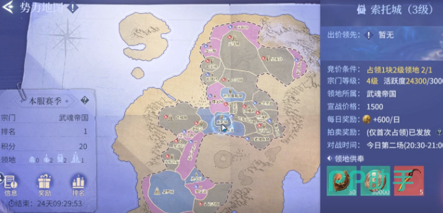 想要参与宗门领地战,首先必须加入一个活跃且等级较高的宗门。宗门等级和成员活跃度直接影响能否报名参战。以索托城为例,作为三级区域,其竞价门槛要求宗门已占领一块二级领地,并且宗门自身等级需达到四级才能具备争夺资格。因此,在挑战高级领地前,务必确保宗门综合实力达标。此外,个人修为也不容忽视,通过完成主线任务和日常活动来提升战斗力,将有助于在战场上发挥更出色的表现。