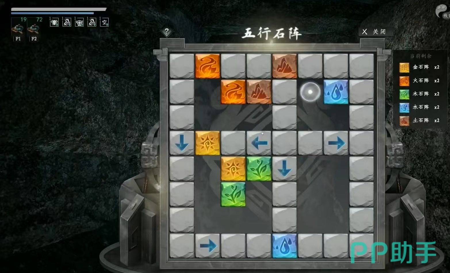 玩家可通过方向键控制光标选中箭头石块,并推动整行或整列的同色石块进行位移。当相同颜色的石块彼此相邻时,会触发消除机制,逐步清除所有石块后也能完成解密。此外,直接依照金→木→水→火→土的标准五行顺序点击调整,也是一种稳定有效的破解方式。值得注意的是,每次触发机关时阵型都会随机变化,建议多次尝试以寻找较易处理的布局再正式操作。成功解开后,便可进入地宫主体区域。