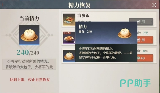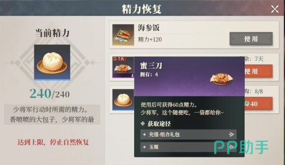 游戏中,体力的自然恢复难以满足急于求成的玩家,此时道具的助力便显得尤为重要,首当其冲的便是海参饭,仅需消耗一个就会恢复120点体力,这个道具玩家可通过充值组合礼包或玉简轻松获取,但需留意体力值的上限为240点,超出部分将无法储存。