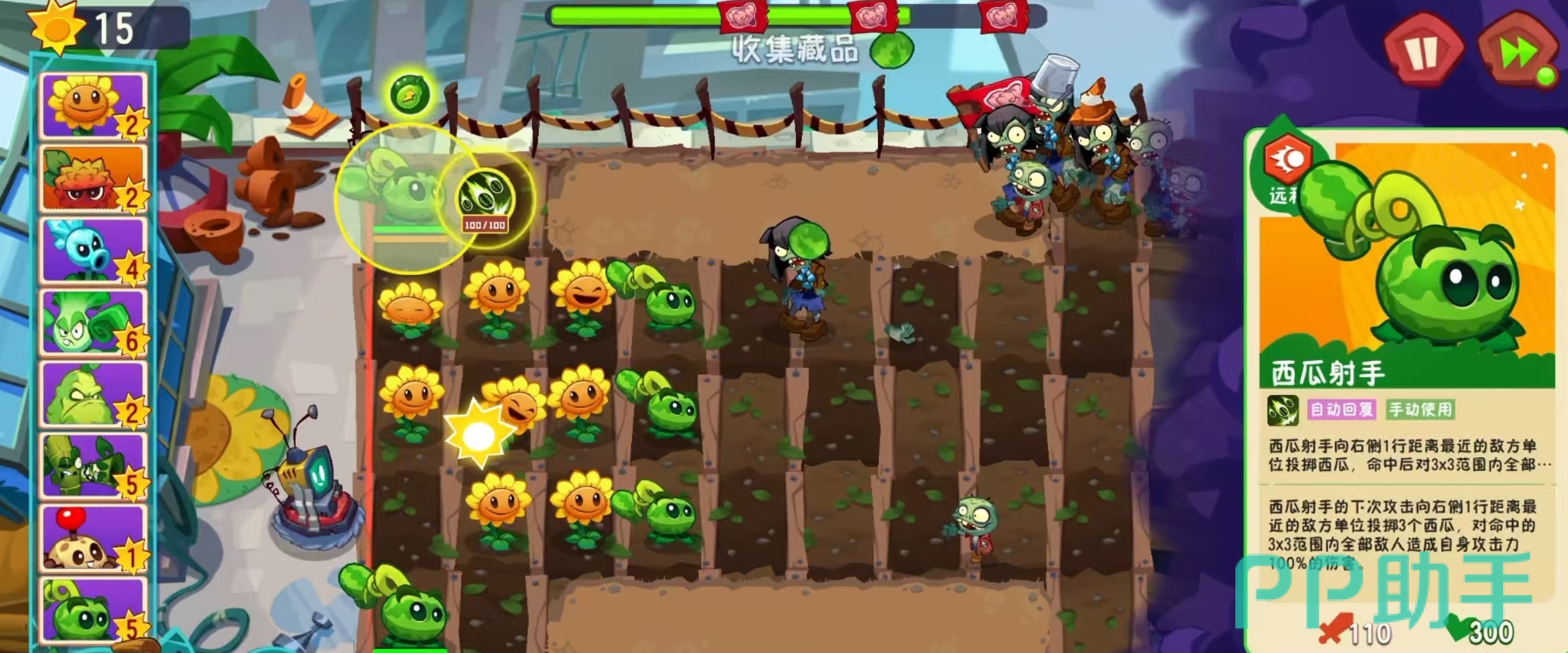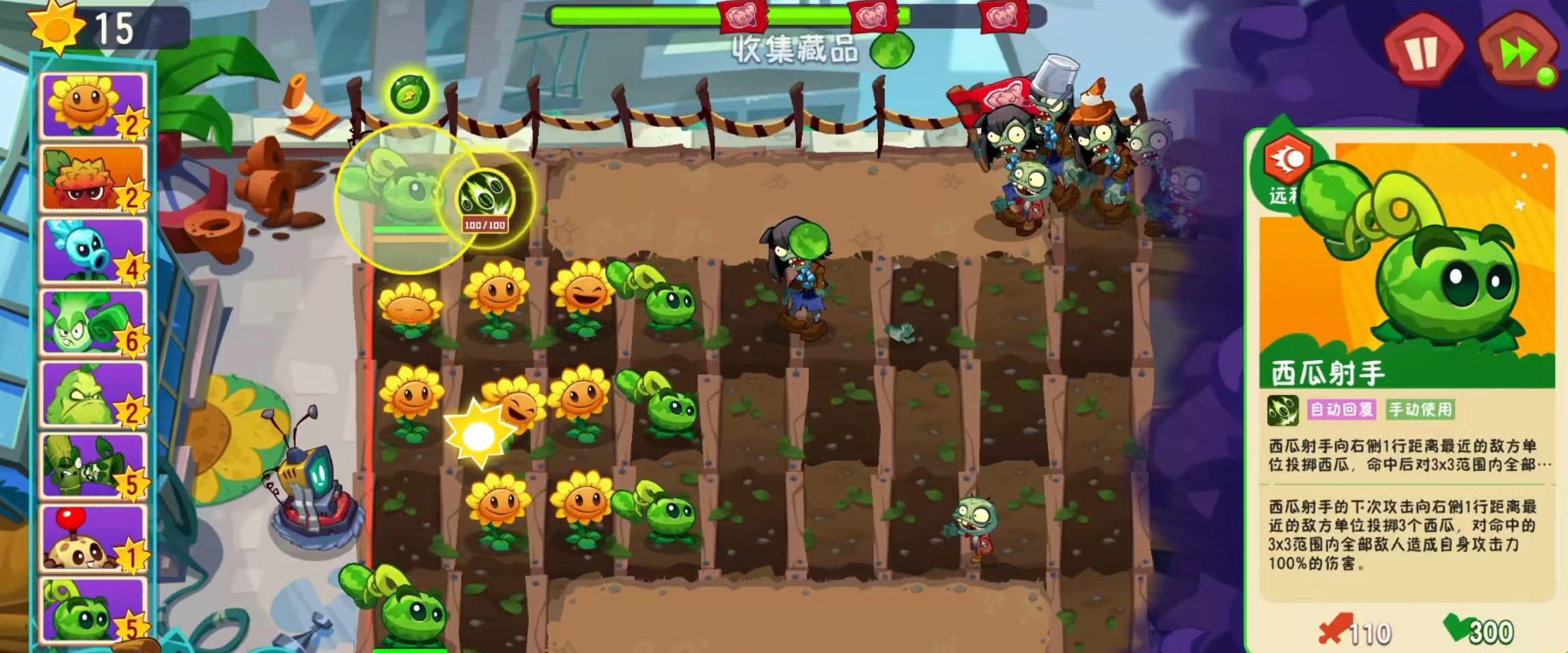 作为一款高伤害的远程攻击植物,西瓜射手的基础攻击力为110,生命值达到300,阳光消耗较低且种植冷却时间短,具备较高的战场部署效率。其核心优势在于能够对多个敌人同时造成可观伤害。攻击机制采用抛物线投掷方式,普通攻击会向右侧一行距离最近的目标发射西瓜,命中后以该点为中心,在3×3范围内的所有敌方单位均受到相当于自身攻击力50%的群体伤害,属于典型的范围型远程火力输出。