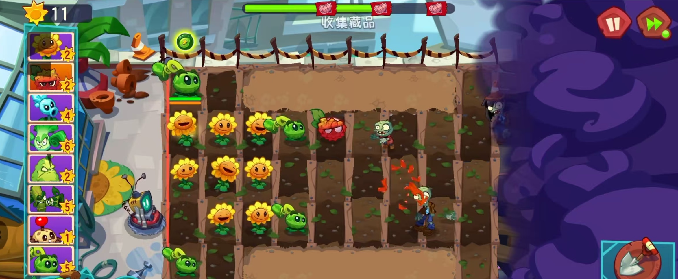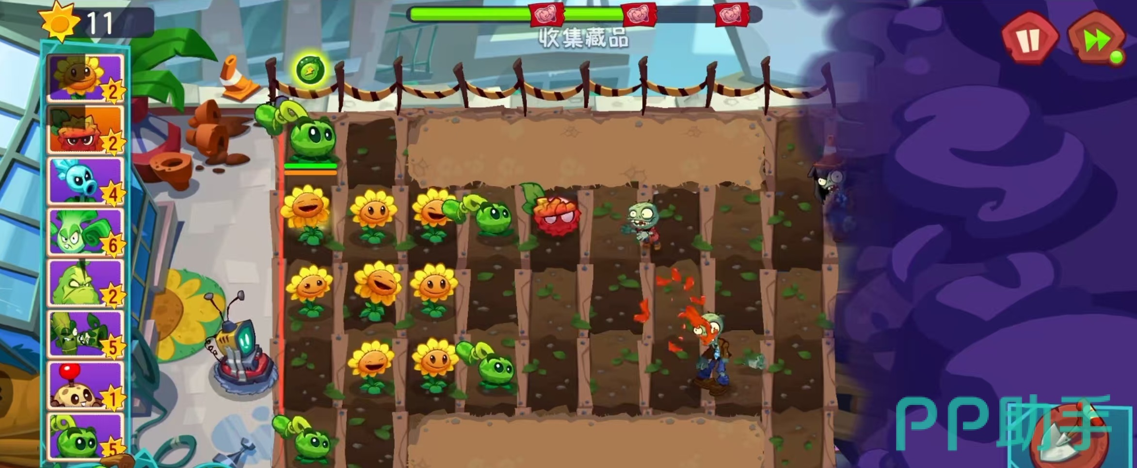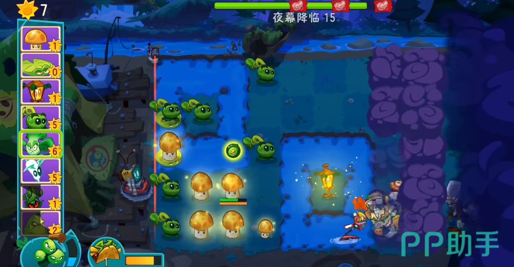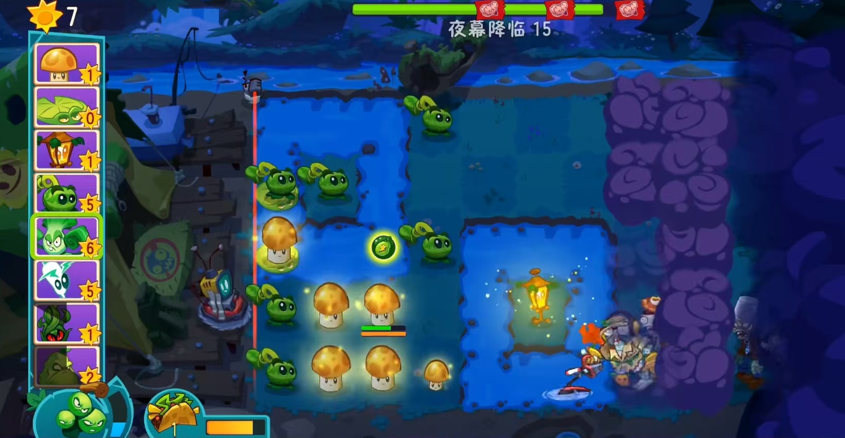 此外,西瓜射手还拥有一个强力技能——三连击。释放后下一次攻击将投掷出三个西瓜,命中目标时在3×3区域内造成等同于其100%攻击力的范围伤害,显著提升清怪效率。当使用叶绿素激活后,可在地图随机位置发动大范围打击,输出爆发极强;而装备玉米卷后,普攻还能附加减速效果,进一步增强控场能力。因此,在面对密集排列的僵尸群时,西瓜射手表现尤为出色。