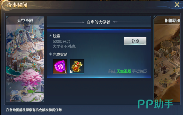 先来说一说自卑的大学者,这项任务的线索是大学者不对劲,在处罚等级上需要玩家达到600级,触发条件非常明确,就是需要玩家在完成天空圣殿这一主线任务后查看邮件就可以触发该秘闻了,在成功触发后玩家回到任务表当中即可。看见该项任务点击自动跟踪就可以开始你的秘闻之旅了。