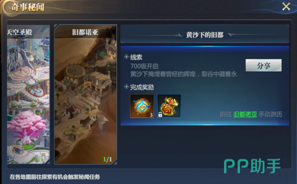 第二个难度较高的密文任务是黄沙下的旧都。线索提示比较明确,“黄沙下掩埋着曾经的辉煌,裂谷中藏着永久”。在等级要求方面,玩家需要达到700级才能开启,触发条件也比较简单,在完成救都诺亚的主线任务后,可以前往救都诺亚的中央大厅逛一逛,触发这项秘闻任务的概率就会大大提升。在触发该任务后,同样可以开启自动跟踪模式,对于很多新手来说还是比较友好的。