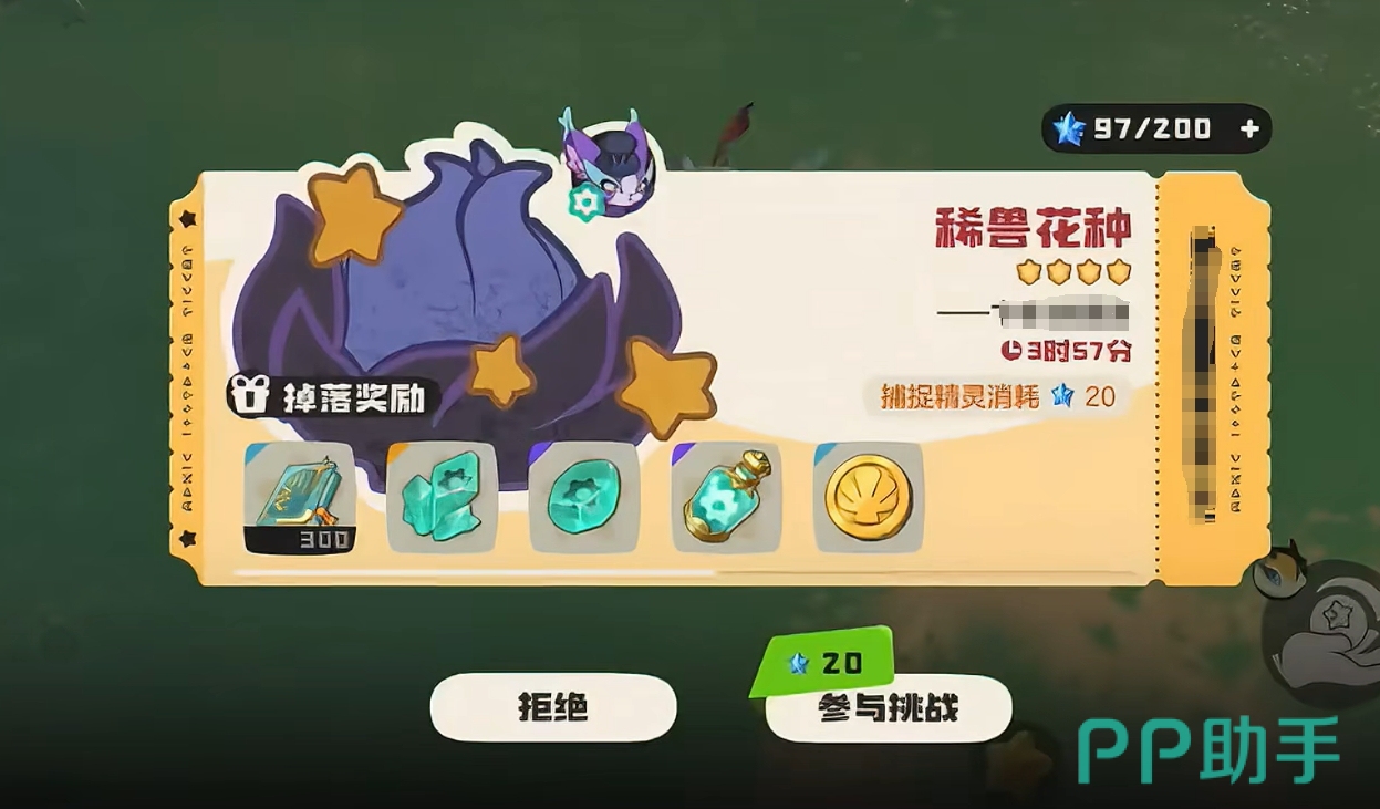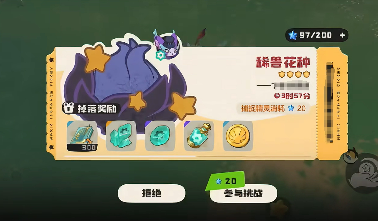 地图上会随机刷出稀兽花种,击败它就有小概率能获得闪光精灵。每一只稀首花种所刷出的精灵都不一样,各位除了能在自己的世界里刷以外,还可应邀去其他人的世界里刷取。每次刷取都需要20体,如果体力不足是没办法拿奖励的。