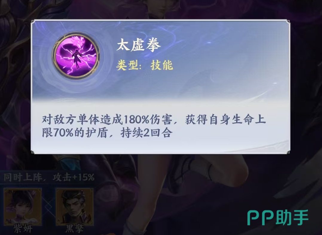 主动技能“太虚拳”是紫妍战术体系的核心:首次释放对敌方单体造成高额伤害,并立即获得相当于自身生命上限70%的护盾,持续两回合;完成升星后,该技能额外触发两项关键效果——为全体友方分摊50%所受伤害;每次承受攻击时,按当前生命值百分比自动补充护盾;且每次受击均有概率削减攻击者怒气值。三项机制叠加,使其在抗压同时兼具节奏压制力,虽无硬控效果,但通过怒气干扰有效延缓敌方大招释放频率,属于功能性极强的战略级前排。