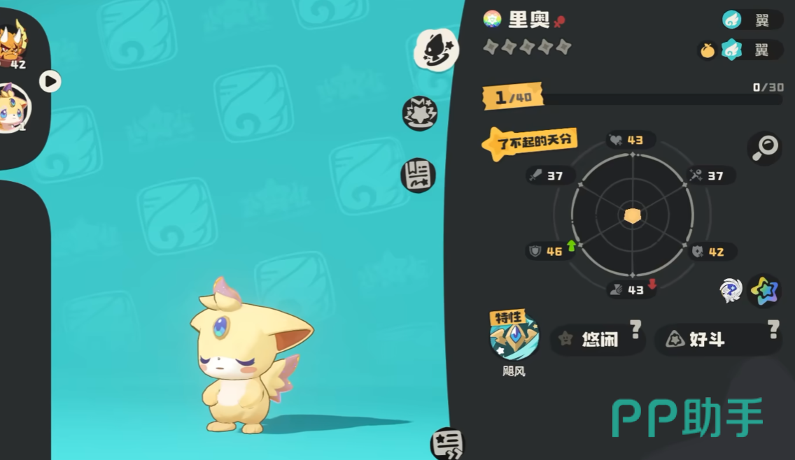 里奥属于翼属性精灵,拥有“飓风”特性,性格偏向悠闲与好斗。其基础属性表现为:物理攻击37点,魔法攻击37点,血量为43点,物理防御和法术防御均为46点,速度同样达到43点,在初期精灵中具备不错的综合能力。