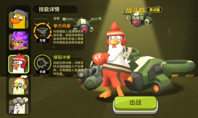 战斗鸡定位为高机动近战核心,擅长突进压制与范围控场。其一技能为“冲拳突袭”:角色向前高速位移并切换至拳击姿态,路径中持续判定碰撞;命中目标瞬间触发基础伤害+爆炸溅射,对命中的主目标及半径1.5米内其他敌人造成额外AOE伤害。该技能兼具位移、破防与群体压制三重效果,是开团与反打的关键手段。