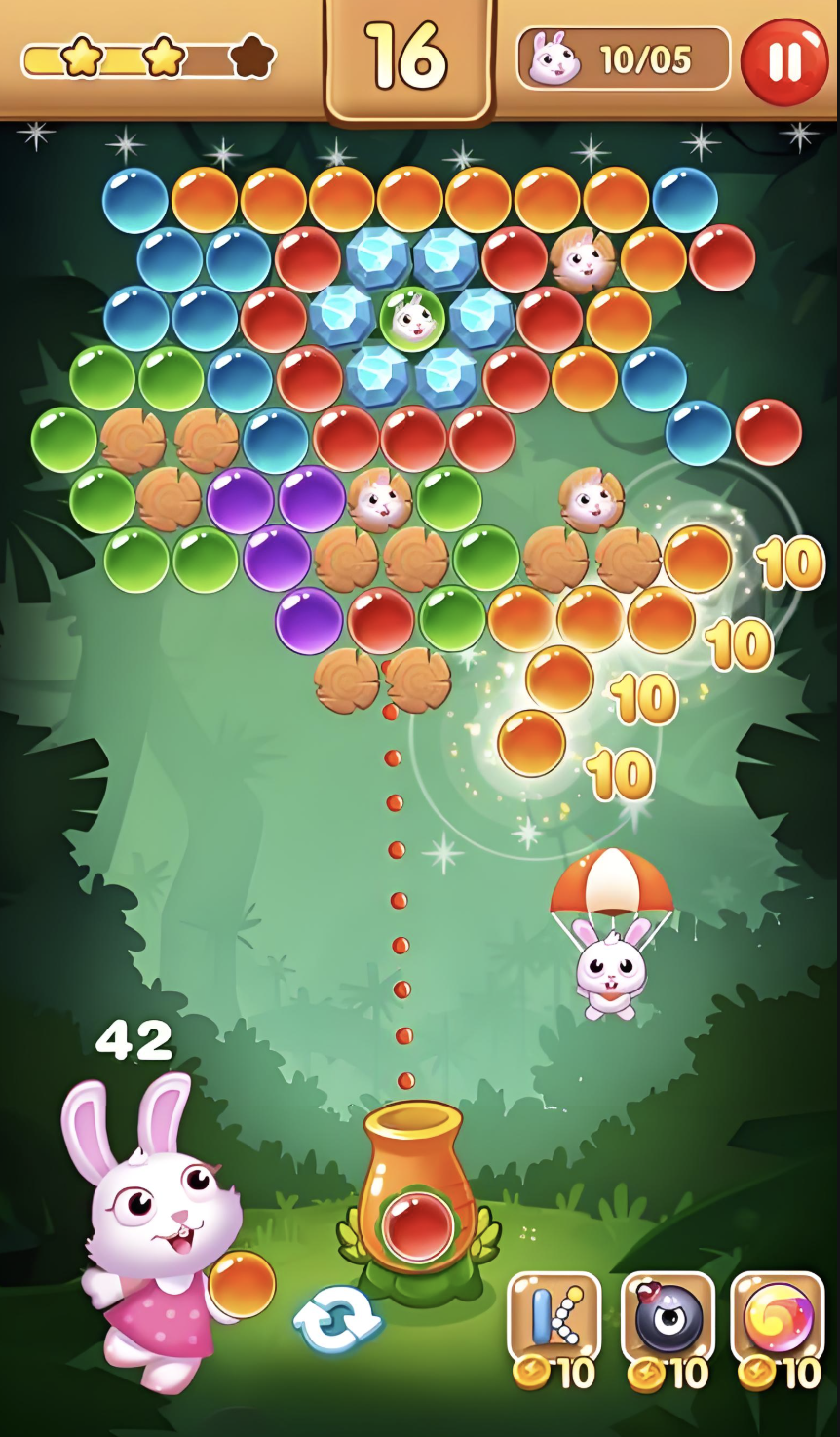 它拥有经典的泡泡射击玩法,画面设计十分可爱,各种色彩鲜艳的泡泡在屏幕上闪烁,形成强烈的视觉冲击,让玩家对颜色的敏感度也能得到锻炼。游戏的操作简单,通过触摸和拖拽就能实现顺畅的射击体验,还能利用墙壁反弹泡泡,增添了不少策略性。玩家可以利用特殊道具和技能,挑战各种难度的关卡。