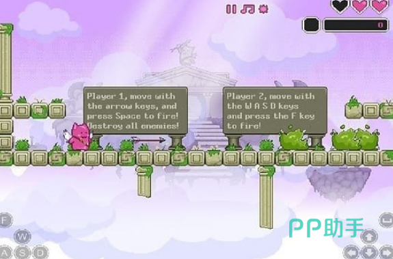 以经典的画风进行创作,虽然从画面上来看,无法和现在的手游相比,但是经典的玩法却让人印象深刻。在开局后玩家将会看到两只非常可爱的肥猫,玩家可通过控制肥猫的方式,利用手中的弓箭疯狂射击各个关卡中的怪物,每个关卡中的怪物数量都完全不同,玩家只要利用精准瞄准以及聪明的思维能力,就能快速取得胜利,此游戏支持两人共同参与。