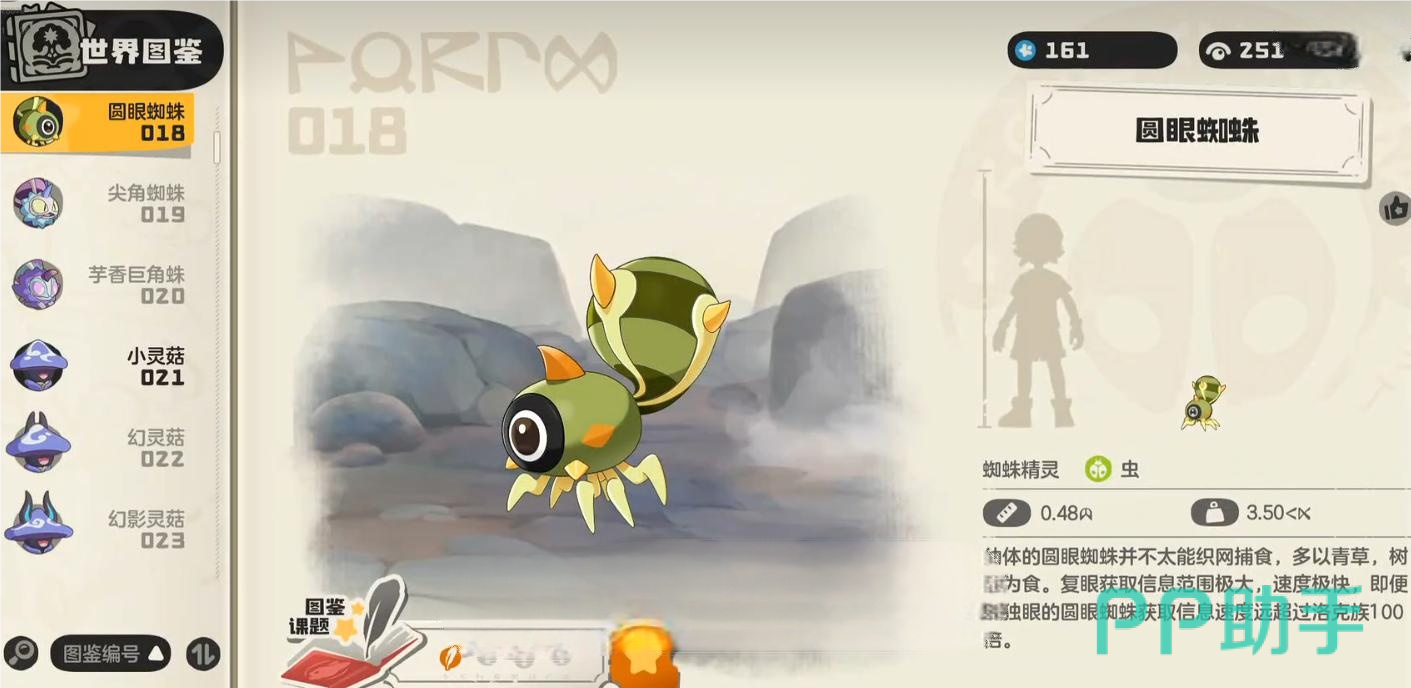 想要获得芋头香巨角蛛,首先需要捕捉它的初始形态——圆眼蜘蛛。这种精灵在游戏中分布较广,属于常见种类,但由于体型偏小,容易被玩家忽略。若想成功捕获,建议前往护住犬所在区域的后方草地,那里是圆眼蜘蛛的主要刷新点,多加留意即可发现它的踪迹。