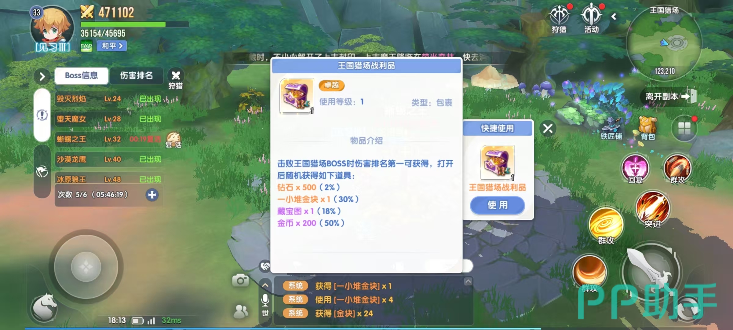 风之国世界是一款融合多职业体系与高自由度成长路径的幻想题材MMORPG。游戏以自动战斗为核心机制,大幅降低操作门槛,让玩家更聚焦于策略规划与资源管理。其中,“王国猎场”作为高频产出型日常玩法,自玩家达成指定等级并通关主线后即可解锁,是获取魂石、稀有材料及战力养成资源的关键途径。