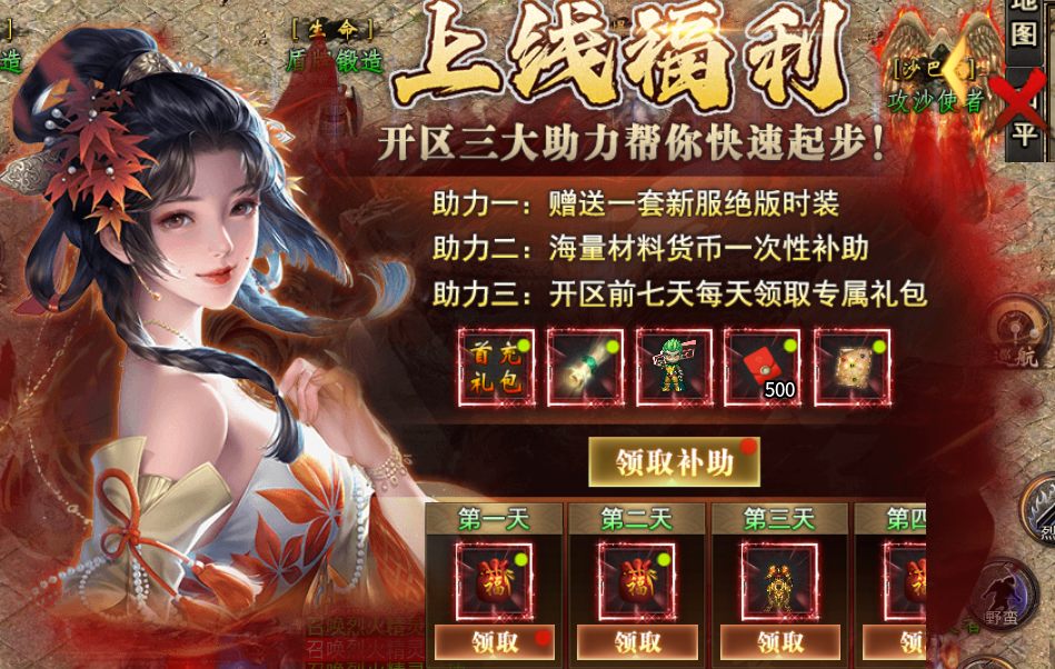 其中,开区前七日成长计划是当前主力运营活动之一。该活动按天解锁对应奖励,节奏清晰、门槛友好:首日与次日发放通用福袋;第三日赠送稀有神装;第四日再次开放福袋领取。整套设计旨在帮助新号快速完成基础装备配置与战力构建。
