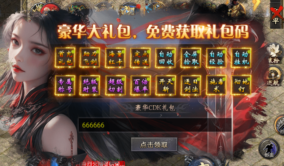 除七日签到外,新区还同步开放三项核心扶持机制:其一为新服限定时装,全服首发、不可复刻;其二为新手开荒资源包,内含首充双倍返利礼包、高级卷轴、500元宝红包等关键成长道具;其三为登录即领的豪华大礼界面,预设通用礼包码“666666”,支持一键批量领取,覆盖经验药水、金币、强化石等高频消耗品。