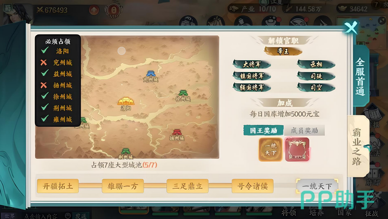 游戏开启后的第一天,由于系统机制限制,尚无法对世界地图中的城池发起进攻。此时的重点应放在主线任务推进、角色等级提升以及武将阵容搭配上。建议玩家进入“一统天下”玩法界面,查看各关口、州城及皇城的具体开放时间,做到心中有数,提前制定战略部署。同时可通过“霸业之路”功能了解不同城池被占领后所能解锁的王国奖励、成员福利以及官职权限,从而根据自身发展目标,预判优先攻占目标,确保资源收益最大化。