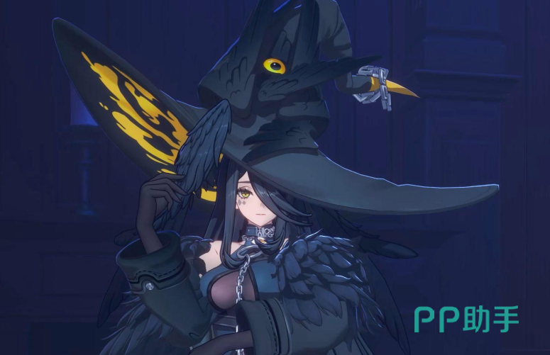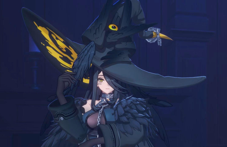 黑羽的形象融合了哥特式魔幻美学与鸦神图腾意象:头戴由活体乌鸦凝构而成的宽檐礼帽,双臂覆有流动般的漆黑羽翼纹理,颈间环绕一条暗银锁链,项圈中央嵌有一枚泛着幽光的乌鸦眼状饰物。其神情沉静而疏离,兼具神性威压与悲悯气质。首次登场于“魔女之屋”场景,彼时她尚以非人形态存在——仅作为一顶可对话的 sentient 帽子出现,玩家可通过互动触发占卜类小游戏,由此开启对其本质的初步探索。