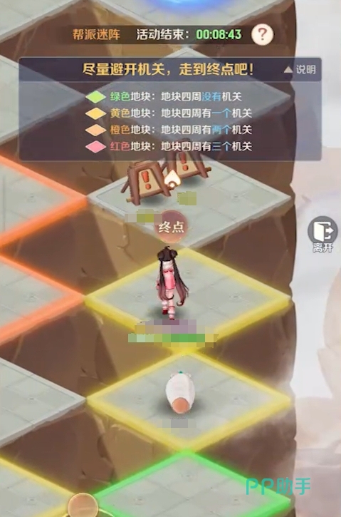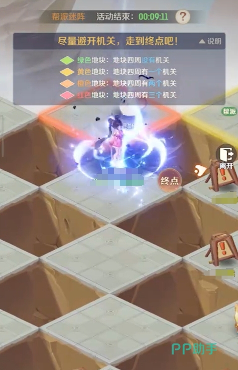 帮派迷阵为限时开放活动,固定于每周一、三、五、日的12:00及18:00两个时段开启。其核心机制借鉴经典逻辑推演模型,玩家需依据地面格子的颜色提示,判断相邻区域是否存在机关陷阱,并规划唯一安全路径抵达终点。具体规则如下:绿色格子表示其上下左右四个相邻格子全部无陷阱;黄色格子代表四邻中恰好存在1个陷阱;橙色格子对应2个陷阱;红色格子则意味着四邻中有3个陷阱格。需特别注意——每个格子仅与正交方向(上、下、左、右)的四个格子相连,因此当踩中红色格子时,应立即折返,避免继续前行触发惩罚。
