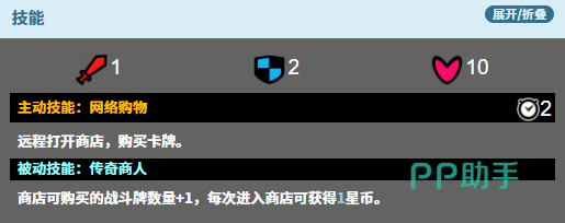 其被动效果具备双重增益:每次进入商店时,除常规购卡外,额外获得星币;同时商店内可购买的战斗牌数量+1。虽然单次仅多购一张卡,但持续叠加的星币收益将显著提升整局卡池调度效率。前期若能快速触发该被动,队伍手牌成型速度将远超常规节奏,为中期战力跃迁奠定基础。