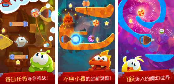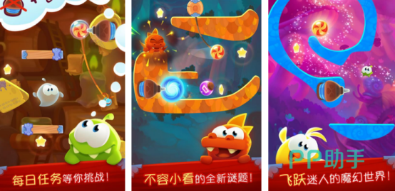 根据割绳子进行全新升级,这里将经典的玩法以及故事背景传承的淋漓尽致。但是还在细节上进行了全新升级,给玩家带来了极好的视觉冲击力,也采用的是3d的高清画面。玩家将要帮助其中的小吃货,将邪恶的巫师彻底打败,还要成功夺回被偷走的糖果。其中涵盖了100多个不同的魔幻谜题,以及让人欲罢不能的大boss关卡。