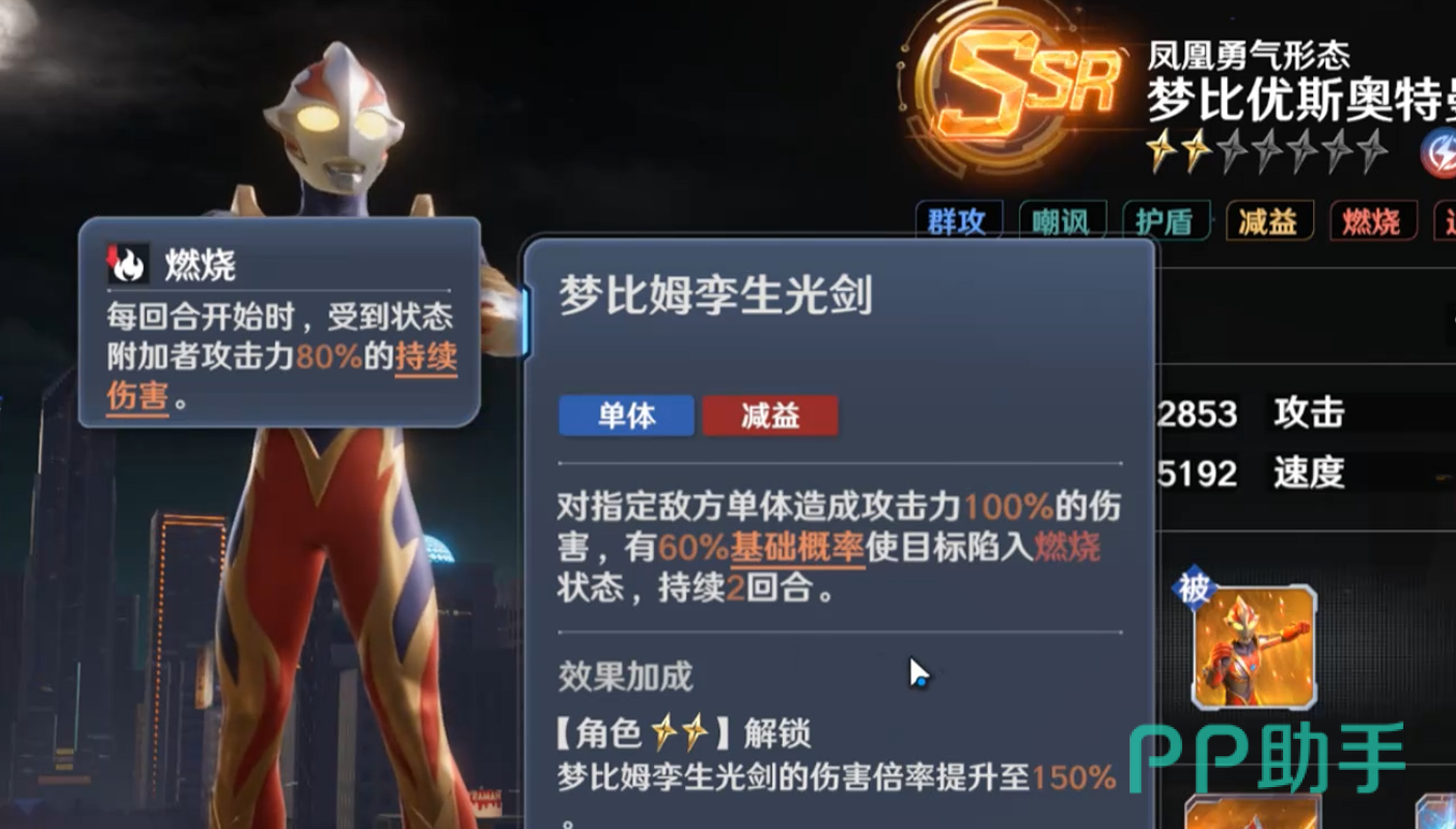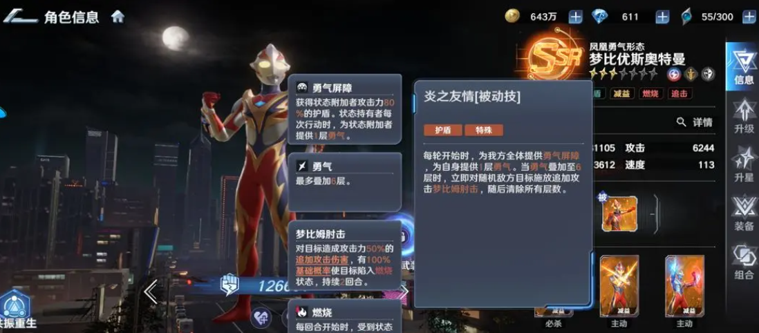 凤凰勇者的技能体系围绕“灼烧状态转化”与“全队暴击伤害增幅”双轴展开,实现输出、生存与辅助的高度统一。其基础定位兼顾血量承伤、防御韧性与攻击频率,属于泛用性强、适配度高的战术核心。必杀技梦比姆骑士射线不仅具备高额单体爆发,更在角色升至七星后解锁质变效果:命中目标后施加凤凰标记,使该目标在后续受到的暴击伤害提升,且此增益可与队伍其他火系或灼烧系角色形成协同,显著放大BOSS战阶段的整体DPS输出效率。