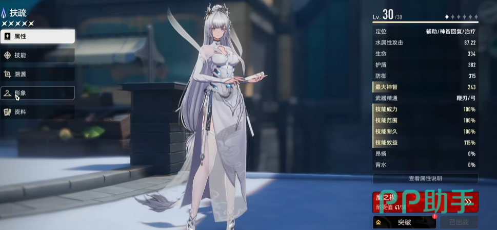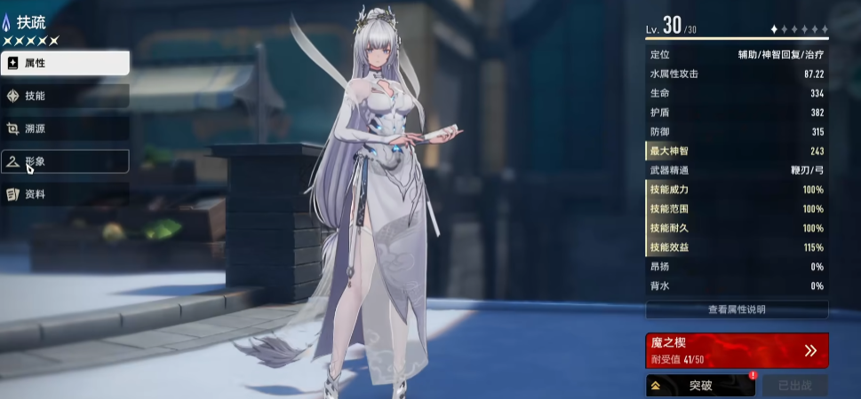 扶疏在此阵容中担任核心支援角色,主要功能为维持团队续航。她的技能可为全体成员恢复生命值,并同步回复“神志”资源——该属性为释放技能所必需的能量值。因此,扶疏的回能效果实质上提升了队伍的技能循环频率,确保长时间连续作战不中断。相比传统治疗型辅助,她在能量供给方面的优势尤为突出,同时还可附加团队增益,进一步增强整体战斗力,是一位多维度支持型角色。