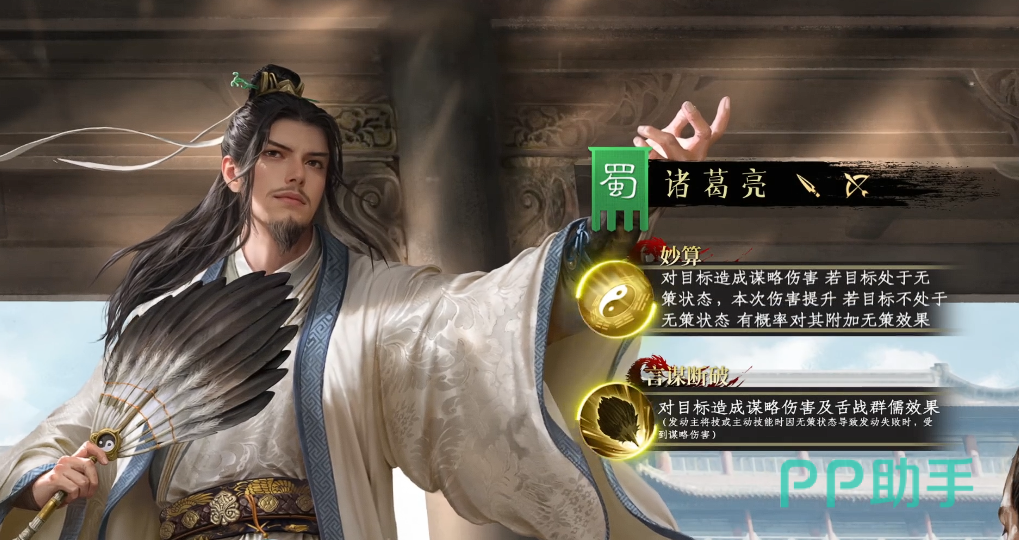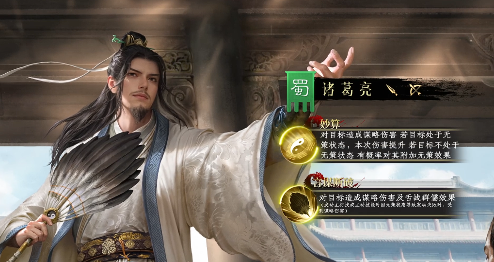 诸葛亮是策略系输出的标杆人物,具备免控特性与高阶谋略压制能力。其技能可对敌方施加“无策”状态,命中后提升自身50%伤害;当“无策”效果以50%概率成功叠加时,还将触发“舌战群儒”,使目标在6秒内每次发动主将技能时额外承受一次谋略伤害。该机制将防御性免控与进攻性反制深度融合,真正实现以攻代守的战略价值。