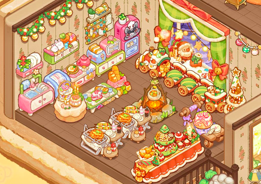 比如说在厨房当中玩家可以以增加稀释糕点也可以增加一款复古风的围炉这样让房间看起来既温馨又治愈,小编在厨房这个板块还增加了很多的圣诞元素,比如说圣诞老人、圣诞树、圣诞风格的窗帘都可以大大增强温馨感,而且在游戏当中可以考虑在中间地带摆放各种各样的美食,也会让厨房的魅力大大提升。