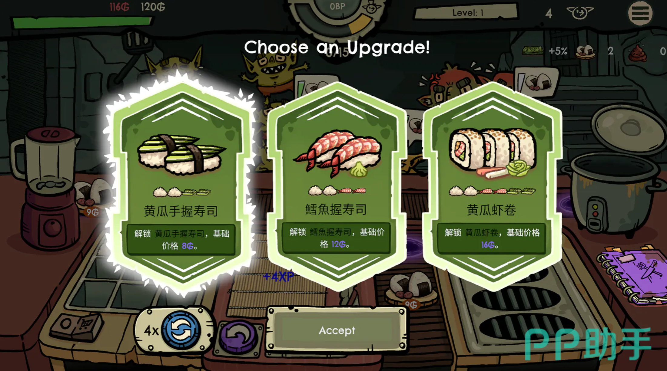 区别于传统放置类经营游戏,《哥布林寿司》深度嵌入Roguelike机制:每次开局地图布局、随机事件、可解锁卡牌均不相同。玩家需根据当局获得的经营卡牌调整策略重心——是优先扩大产能?还是专注高单价寿司?抑或强化防御型设施以应对突发客流高峰?动态决策构成核心体验。